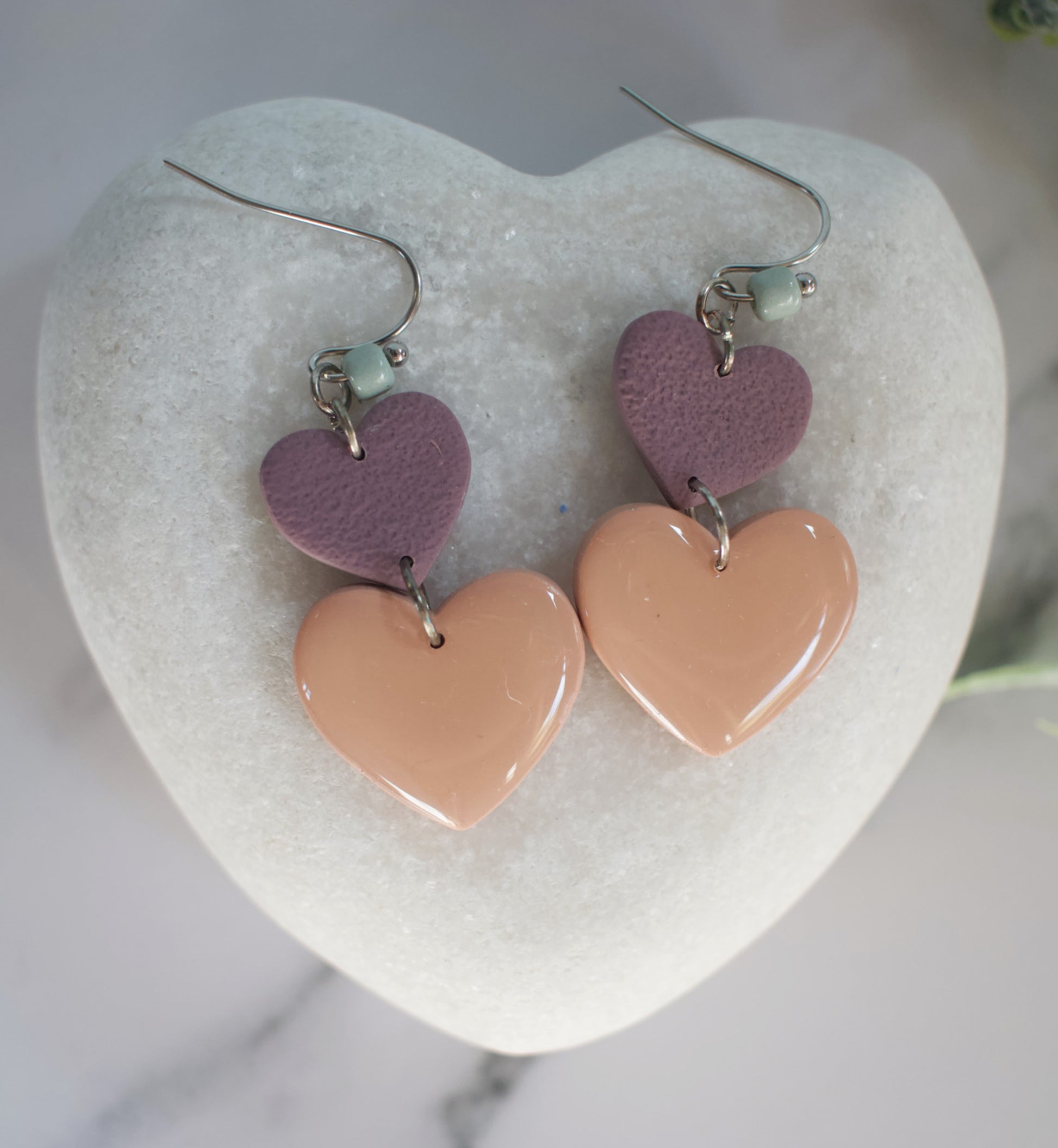 From the Dawn Tones Collection, these earrings are a charming blend of colour and contemporary design. Each pair features two hand-crafted hearts — a smaller matte mulberry heart atop a larger glossy apricot heart — creating a layered, dynamic silhouette. Silver-coloured findings connect the hearts, allowing gentle movement, while a soft sage green bead adds a delicate accent and balance to the design.