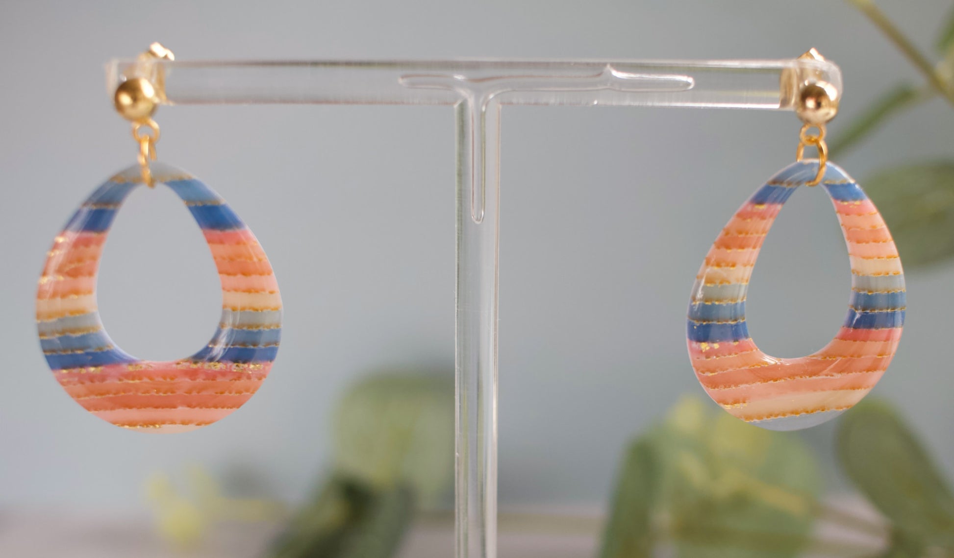 From the Amber Horizon Collection, these striking earrings are hand-crafted from polymer clay in rich tidal blues, soft grey-blues, sandy beiges, and coral pinks. Layered translucent stripes are interspersed with flecks of gold leaf, and a high-gloss resin finish brings out the depth, shimmer, and luminous beauty of each curve.