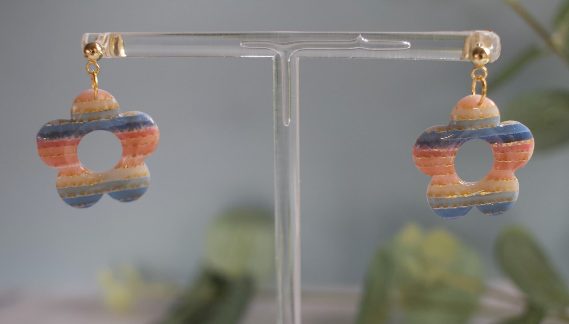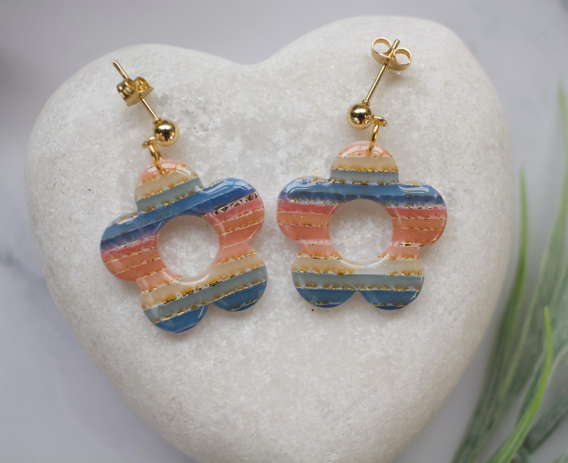 From the Amber Horizon Collection, these bold earrings are hand-crafted from polymer clay in rich tidal blues, soft grey-blues, sandy beiges, and coral pinks. Striped translucent layers are interspersed with flecks of gold leaf, catching the light to reveal depth, shimmer, and the intricate beauty of each carefully stacked layer. A high-gloss resin finish enhances the luminous quality and clarity of every petal.