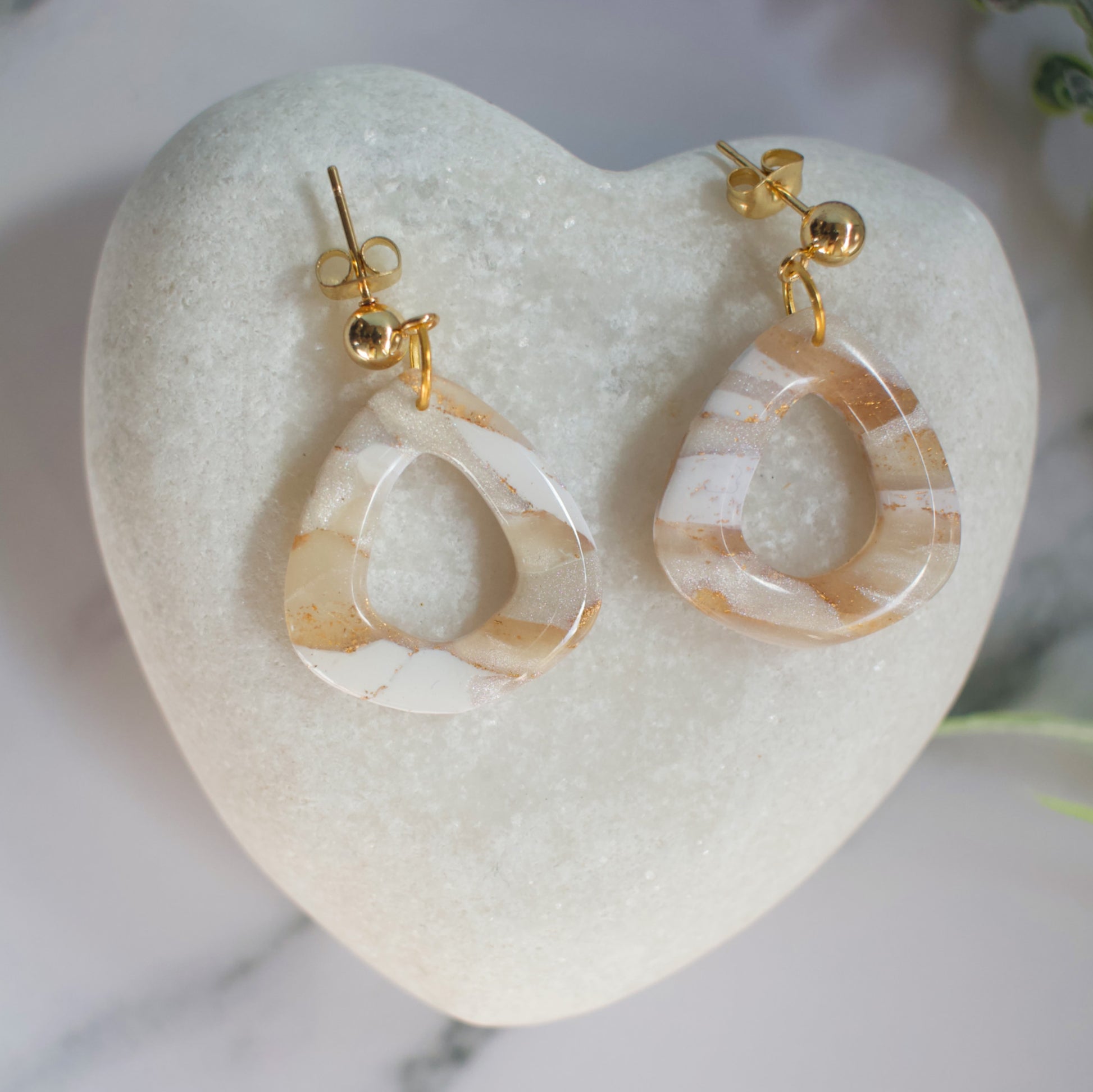 The clay itself is a work of art: layers of translucent tones, pearlescent highlights, and delicate swirls of gold foil create depth and luminosity, as though the earrings were carved from shifting moonlight. Each turn of the head reveals new details hidden in the marbling — shimmering undertones and glowing streaks that seem alive with movement.