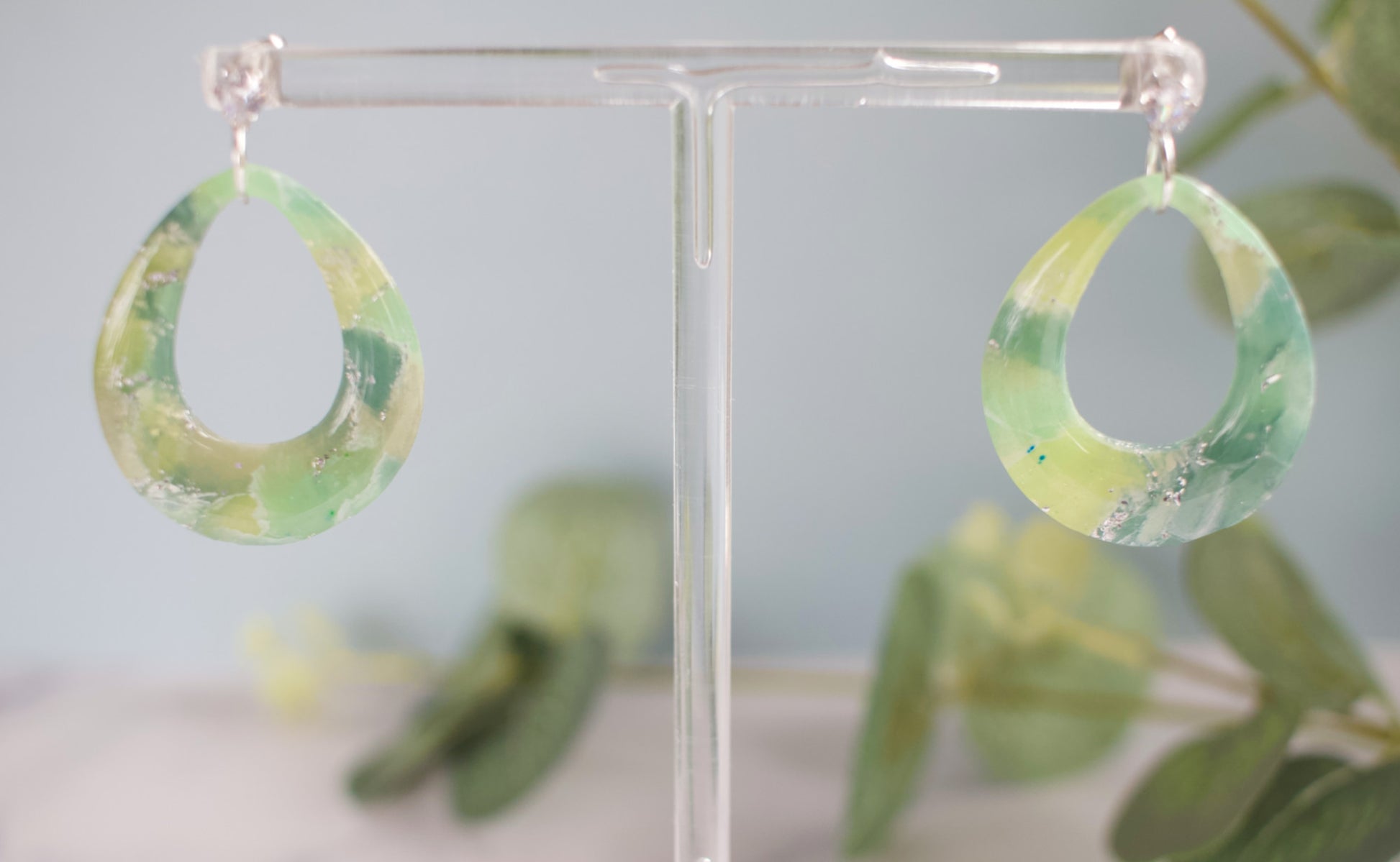 The Silver Fern Collection captures the vitality of lush greenery, and these bold cut-out drops bring that vision to life. Shades of sage, grassy green, and vibrant lime ripple through the clay, sparkling with delicate silver foil. The translucent polymer clay allows these layered tones to shine through, creating depth, movement, and a striking stone-like complexity. A high-gloss resin finish amplifies the shimmer, catching the light with every turn.