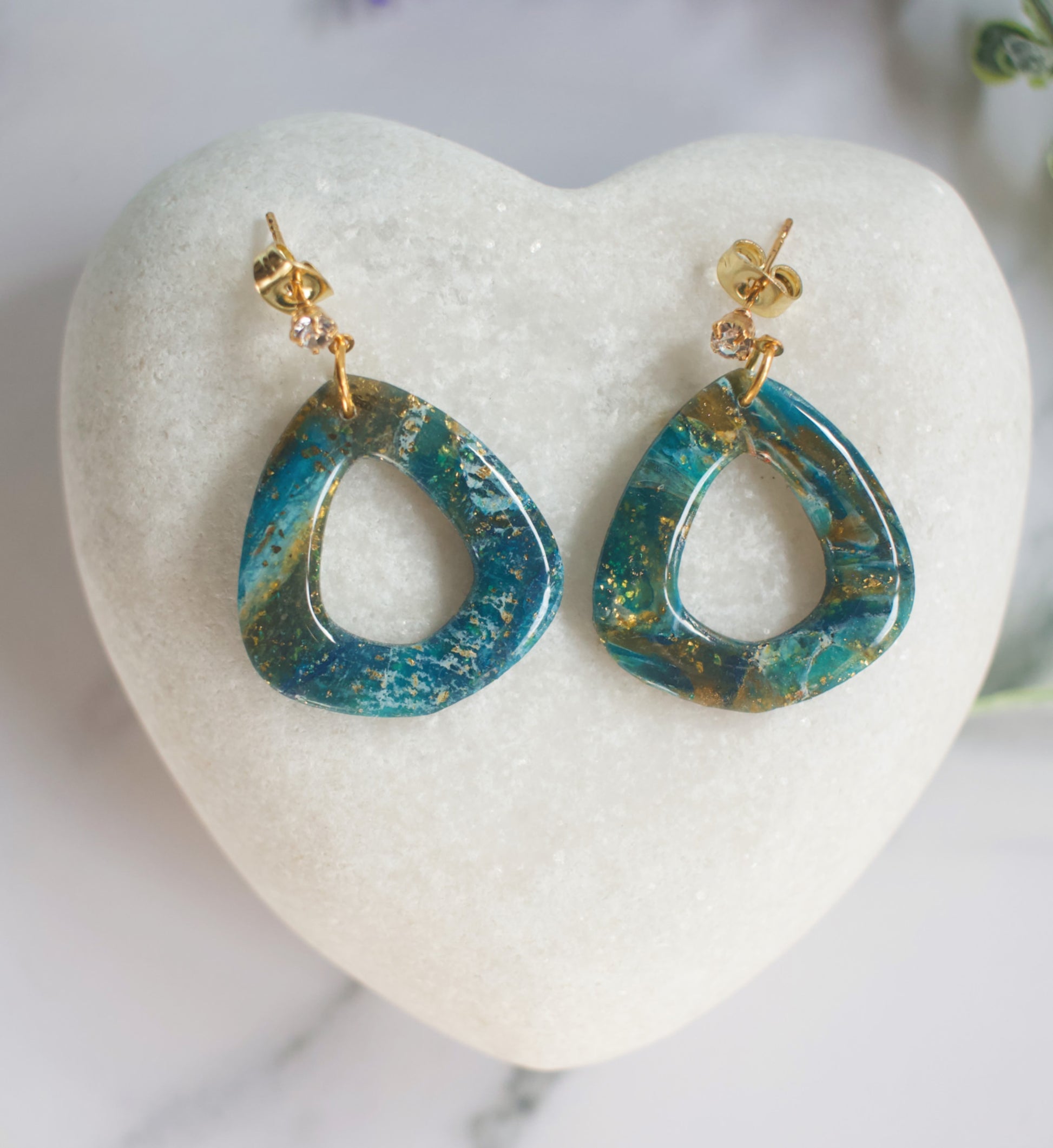 From the Enchanted Stone Collection, these bold cut-out drops are crafted in the Twilight Galaxy colourway — a dramatic marbling of deep teal, midnight navy, and glowing burnt orange. The colours layer and swirl together like a cosmic horizon, evoking the shifting beauty of a twilight sky touched with fire and shadow. Each translucent layer reveals subtle depth, while glimmers of light ripple across the glossy resin finish.