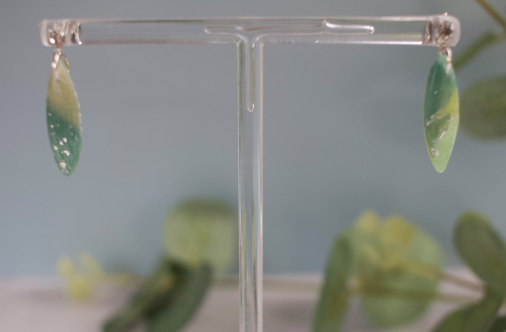 The Silver Fern Collection is alive with the shifting greens of wild meadows, captured here in a dainty, double-pointed drop design. Sage, grassy green, and vivid lime tones are layered with fine silver leaf, their shimmer magnified by the natural translucency of the clay. This depth of colour and sparkle is brought to life under a glossy resin finish, reminiscent of sunlight filtering through fern leaves.