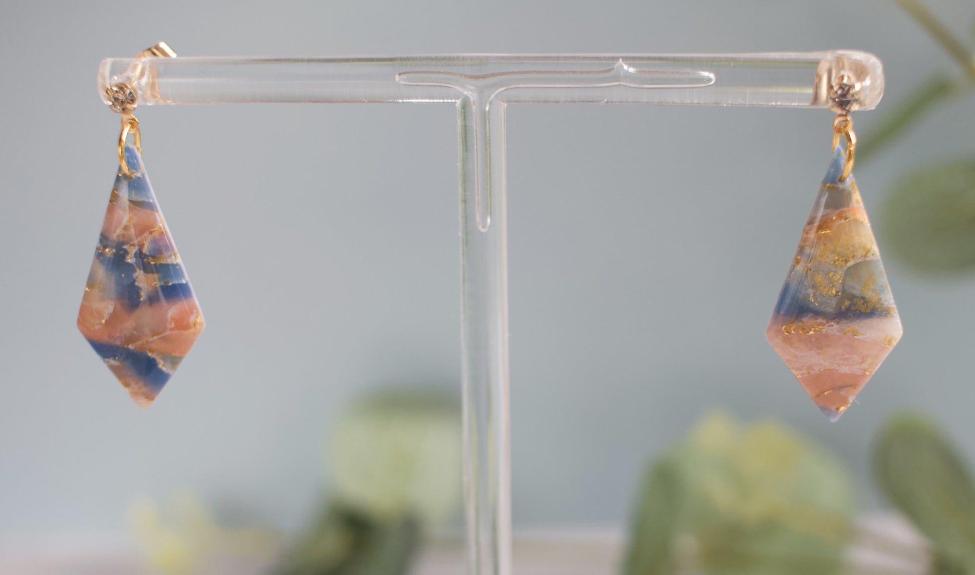 From the Aurora Coral Collection, these earrings are hand-crafted from marbled polymer clay in rich tidal blues, grey-blues, sandy beiges, and coral pinks, creating a deep, layered stone effect. Flecks of gold leaf shimmer throughout, while a high-gloss resin finish enhances the intricate marbling and luminous depth of each unique pair.