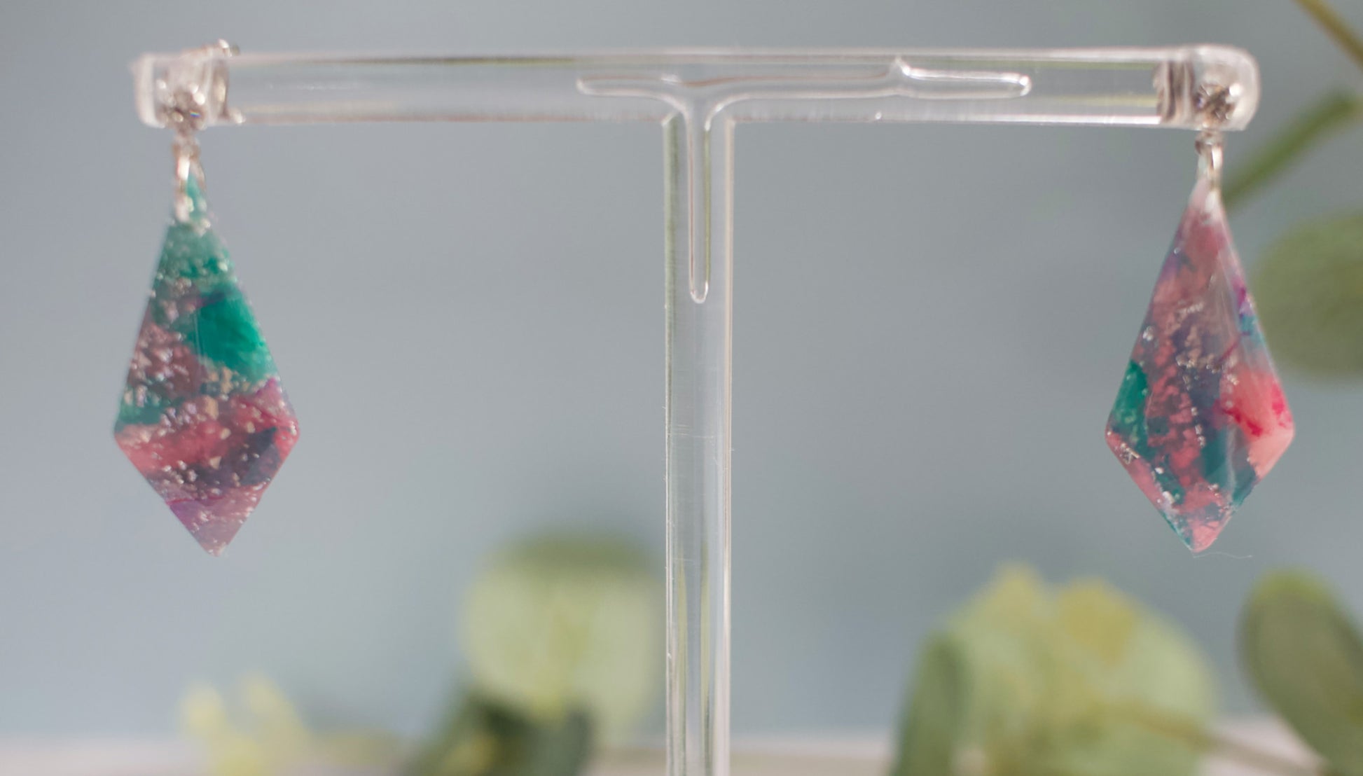 Part of the Seaglass Blossom Collection, these earrings are inspired by glistening tidal pools where turquoise waters meet scattered petals of pink and fuchsia. Hand-crafted from polymer clay, each pair carries layers of translucent colour, with delicate silver foil flecks glimmering like sunlight on the sea. A glossy resin finish draws out every detail, adding luminous depth and polish.