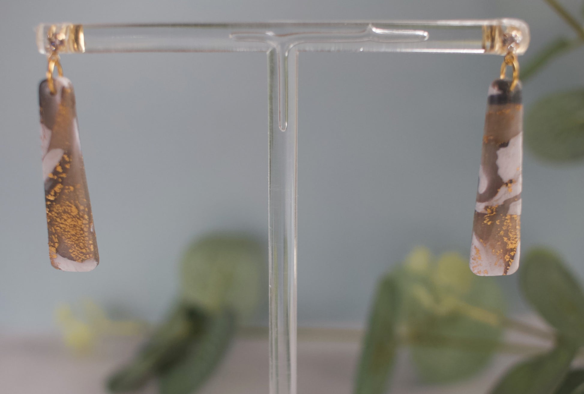 The design is sleek and refined: long rectangular drops, gently tapered toward the top to elongate the silhouette. Suspended from gold-plated diamanté studs, they bring a subtle sparkle that plays beautifully against the high-gloss resin finish of the clay. The effect is both contemporary and timeless — a balance of bold geometry and luxurious detail.