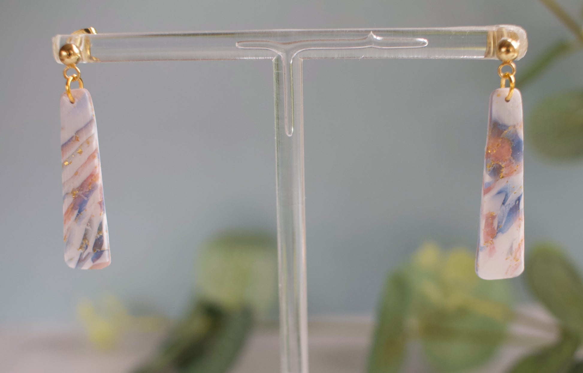 Evoking the serene movement of tides along the shore, these earrings are hand-crafted from marbled polymer clay in soft tidal blues, grey-blues, sandy beiges, and coral pinks, with delicate white highlights like sea foam. Flecks of gold leaf shimmer throughout, and a high-gloss resin finish brings out the depth, detail, and luminous quality of each unique piece.