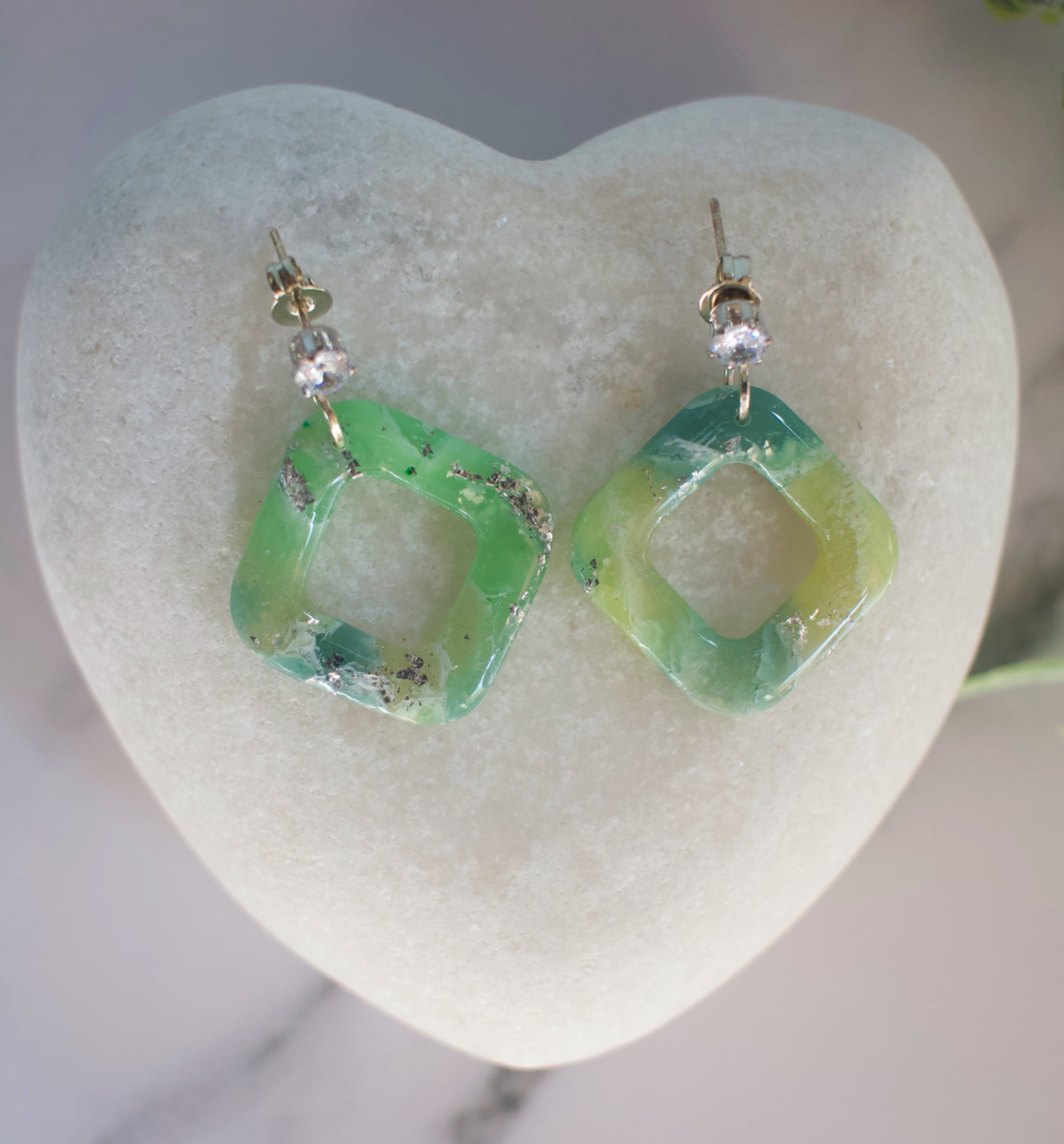 From the Silver Fern Collection, these earrings are a contemporary take on nature-inspired design. Crafted from layered polymer clay infused with sage, grass, and lime green mica powders, the colours ripple together like sunlight filtering through leaves. Scattered silver foil flecks glisten across the surface, and a high-gloss resin finish enhances their depth and shimmer.