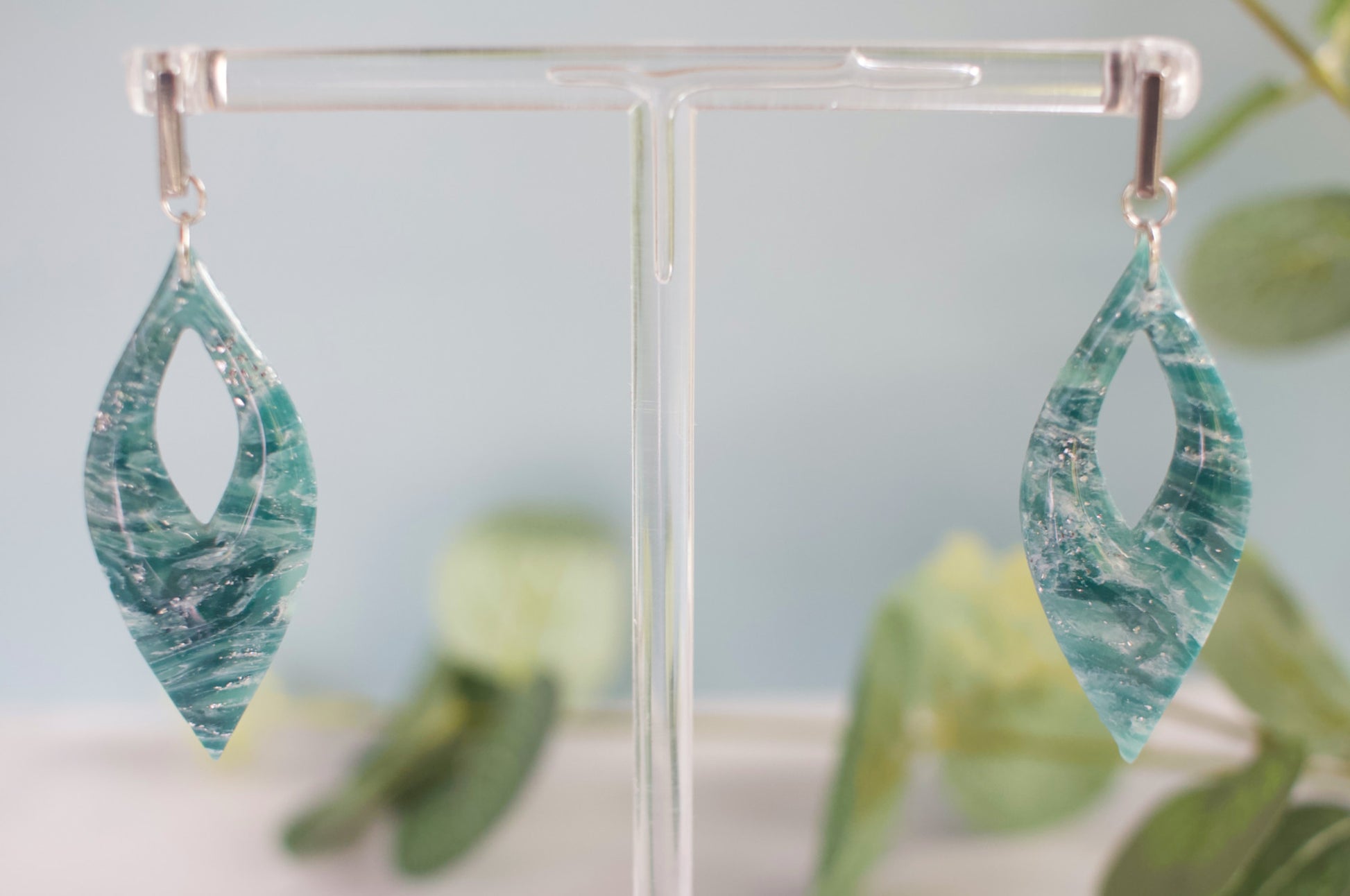 From the Frozen Sea Collection, these bold, statement earrings capture the layered drama and shimmer of ocean waves frozen in motion. Hand-crafted from layered polymer clay in tonal teals — deep, medium, and light — with wisps of white paint to evoke foaming sea spray, each piece is flecked with silver foil that glimmers as it catches the light. The translucency of the clay allows the layers to show through, adding depth, texture, and dynamic detail to each earring.