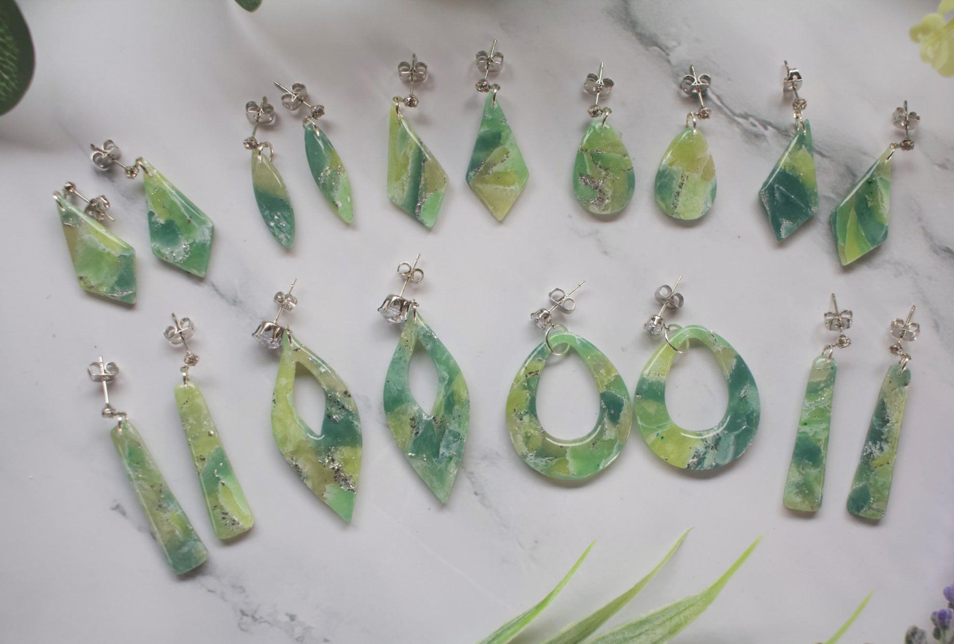 From the Silver Fern Collection, these earrings capture the lush vibrancy of wild greenery glistening in the light. Three shades of green mica powder – sage, grass, and vivid lime – blend together to create a glittering depth of colour, while delicate flecks of silver foil catch the light like dew along a fern. A glossy resin finish enhances the sparkle and adds polish to every curve.