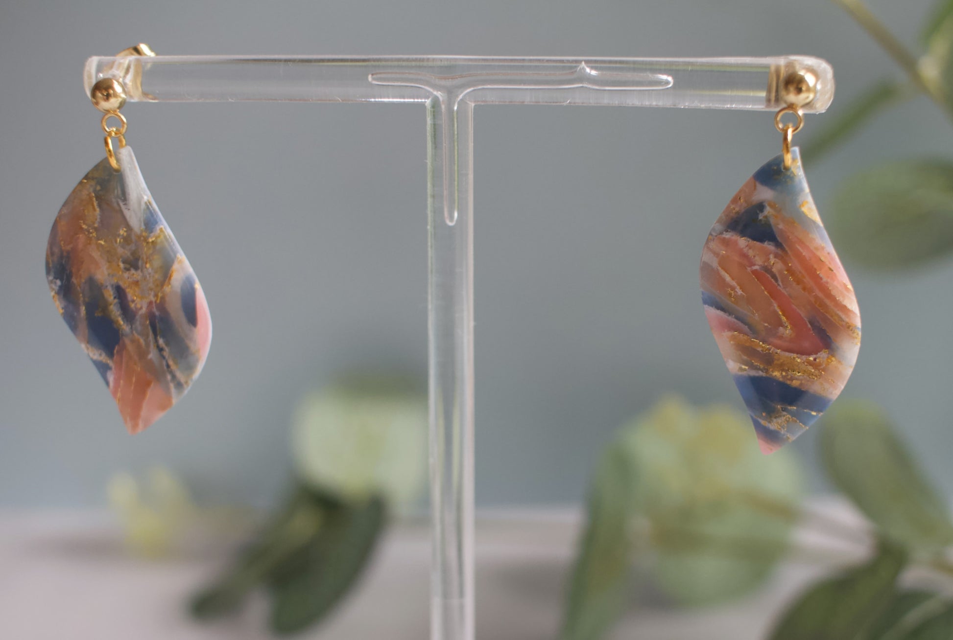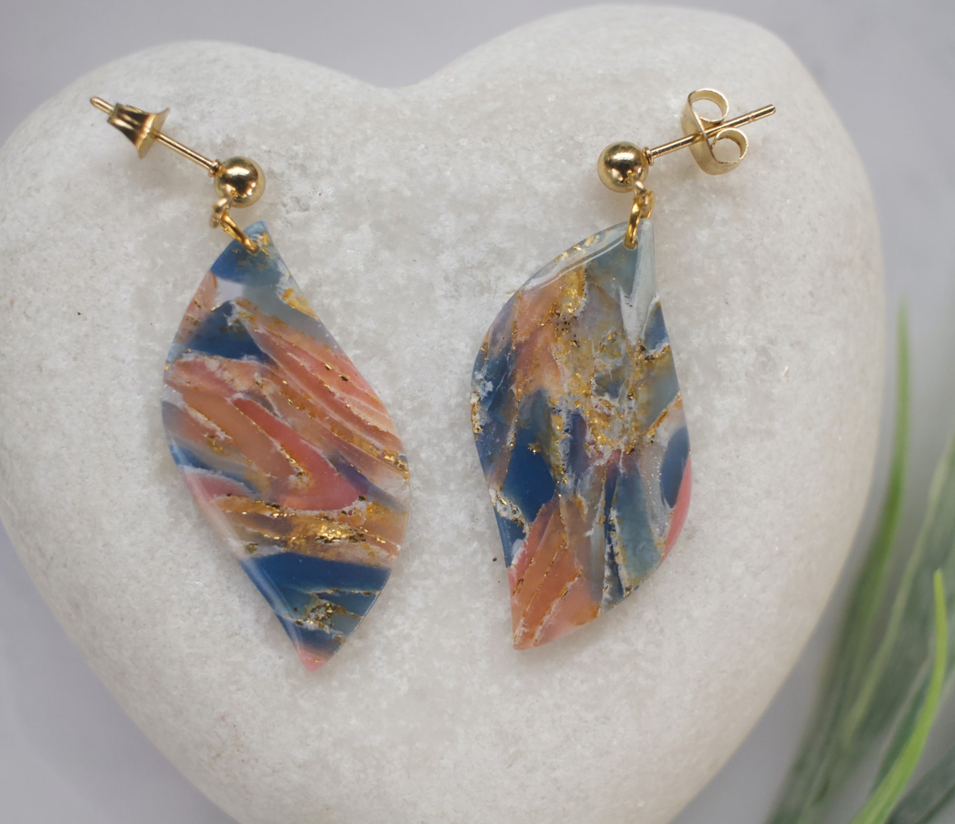From the Aurora Coral Collection, these medium wave-shaped drops are hand-crafted from marbled polymer clay in rich tidal blues, grey-blues, sandy beiges, and coral pinks, creating a layered, dramatic stone effect. Flecks of gold leaf shimmer throughout, and a high-gloss resin finish enhances the depth, detail, and luminous quality of each unique pair.