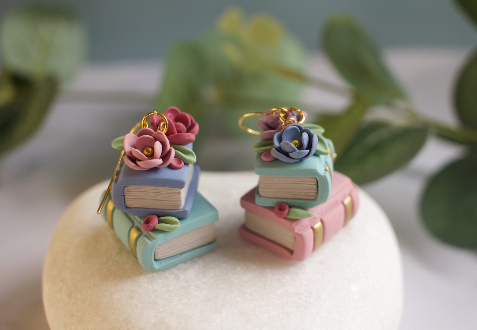 Introducing one of our signature styles — the Floral Book Stacks earrings, a true celebration of craftsmanship and storytelling. These delicate dangles feature two hand-formed clay books, carefully stacked with gilded edges that catch the light just right. Resting atop the books are intricately sculpted flowers and leaves, each petal and leaf lovingly crafted by hand to create a miniature floral arrangement full of life and charm.