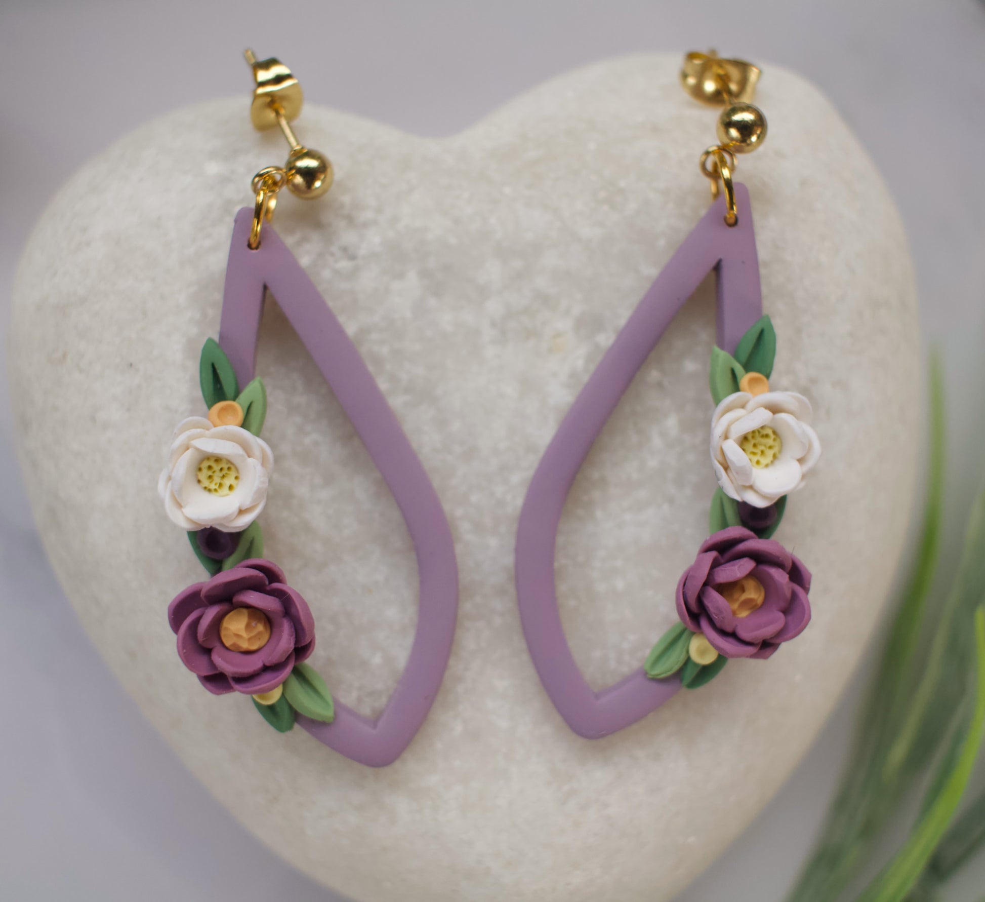 A statement piece from our Summer Floral Collection, these large teardrop earrings showcase a beautiful violet purple base, perfectly complemented by delicately handcrafted purple and white flowers.