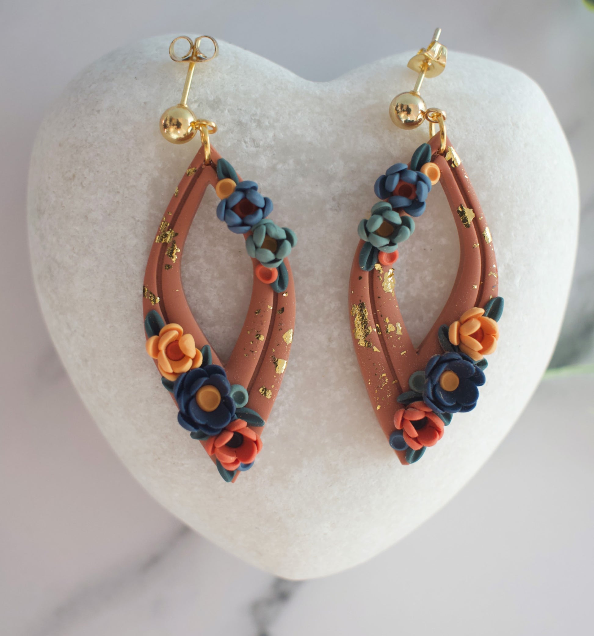 From the Bud & Bloom Collection, these earrings are a one-of-a-kind autumn statement piece. Handcrafted petal by petal, each miniature flower is placed with care along the edges of a double-pointed elongated teardrop in a warm, mid-brown shade. Flecks of gold foil glimmer subtly through the bare clay, catching the light and adding a touch of magic to the earthy tones.